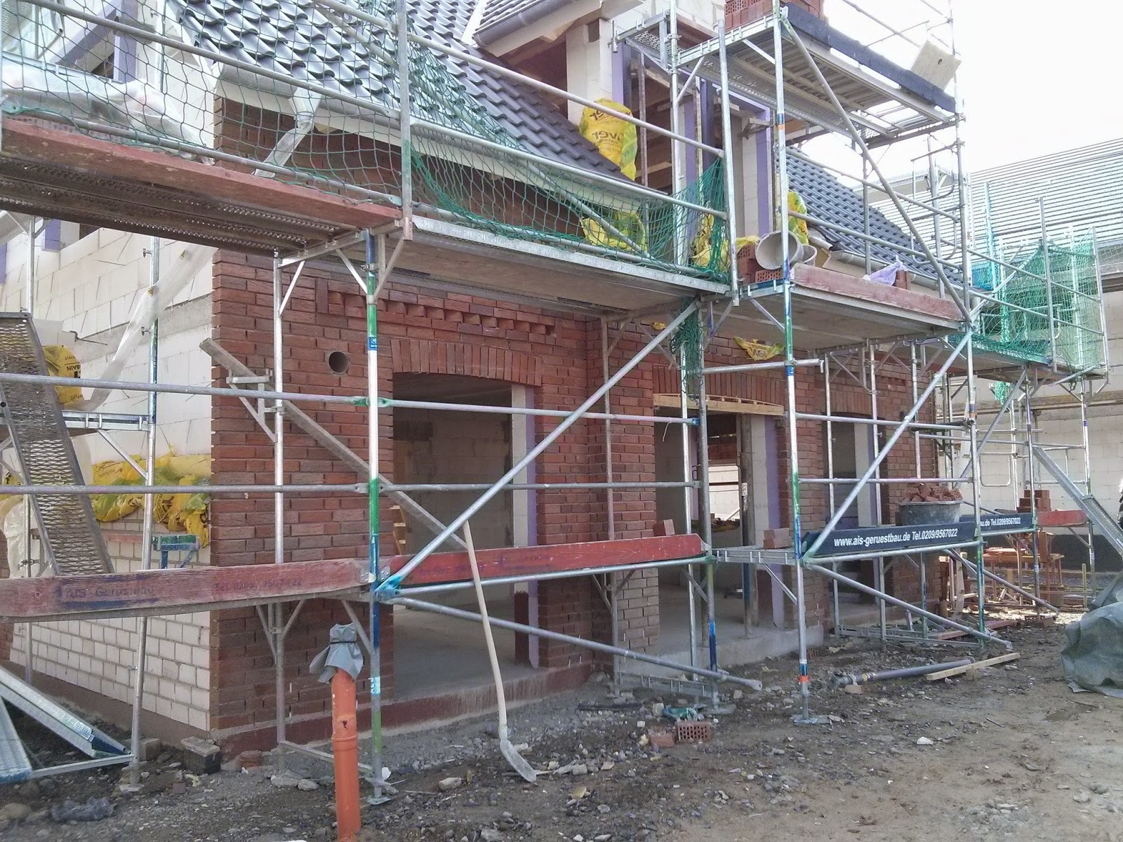 Die Dacheindeckung ist bis auf wenige seitliche Dachpfannen abgeschlossen. Die restlichen Dachpfannen können noch nicht gelegt werden, weil das Gerüst zu nah am Haus steht. Die folgenden Bilder zeigen die Ansicht aus dem Garten auf das Haus. Der obere Teil des Nebengiebels wurde nun auch zu Ende gemauert (ein Stein war kaputt und wurde dann mit Beton gefüllt, siehe zweites Foto).